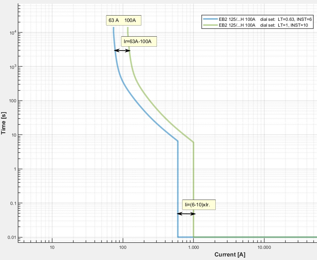 Ir – overload trip, adjustable from (0.6 to 1) × In (in our case 63 A to 100 A)